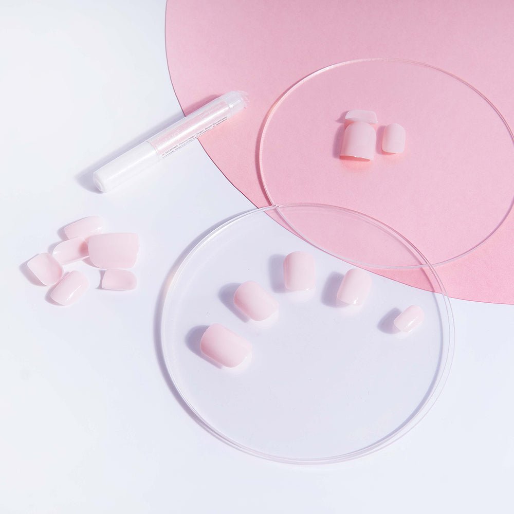 التطبيق: ضعي صمغ الأظافر (يُباع غالبًا بشكل منفصل) على الظفر الطبيعي أو على الجزء الخلفي من الظفر الصناعي.